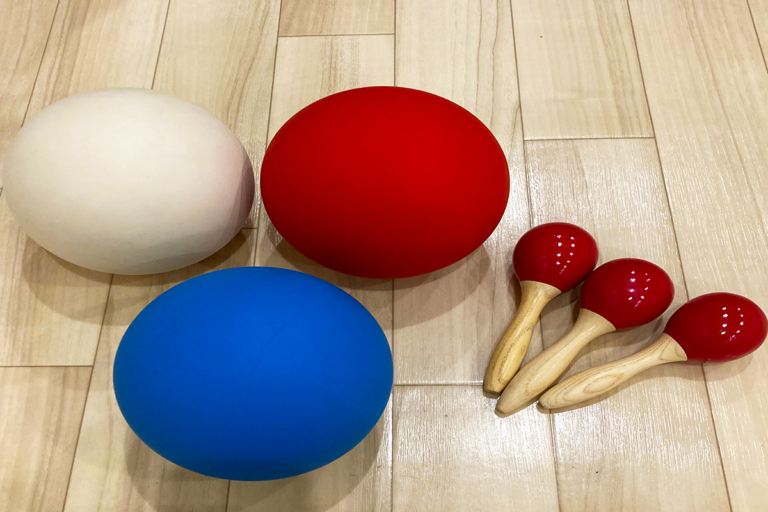 メインとなるリトミックセット1のほか、はり絵シールやミニマラカスなども使用します。